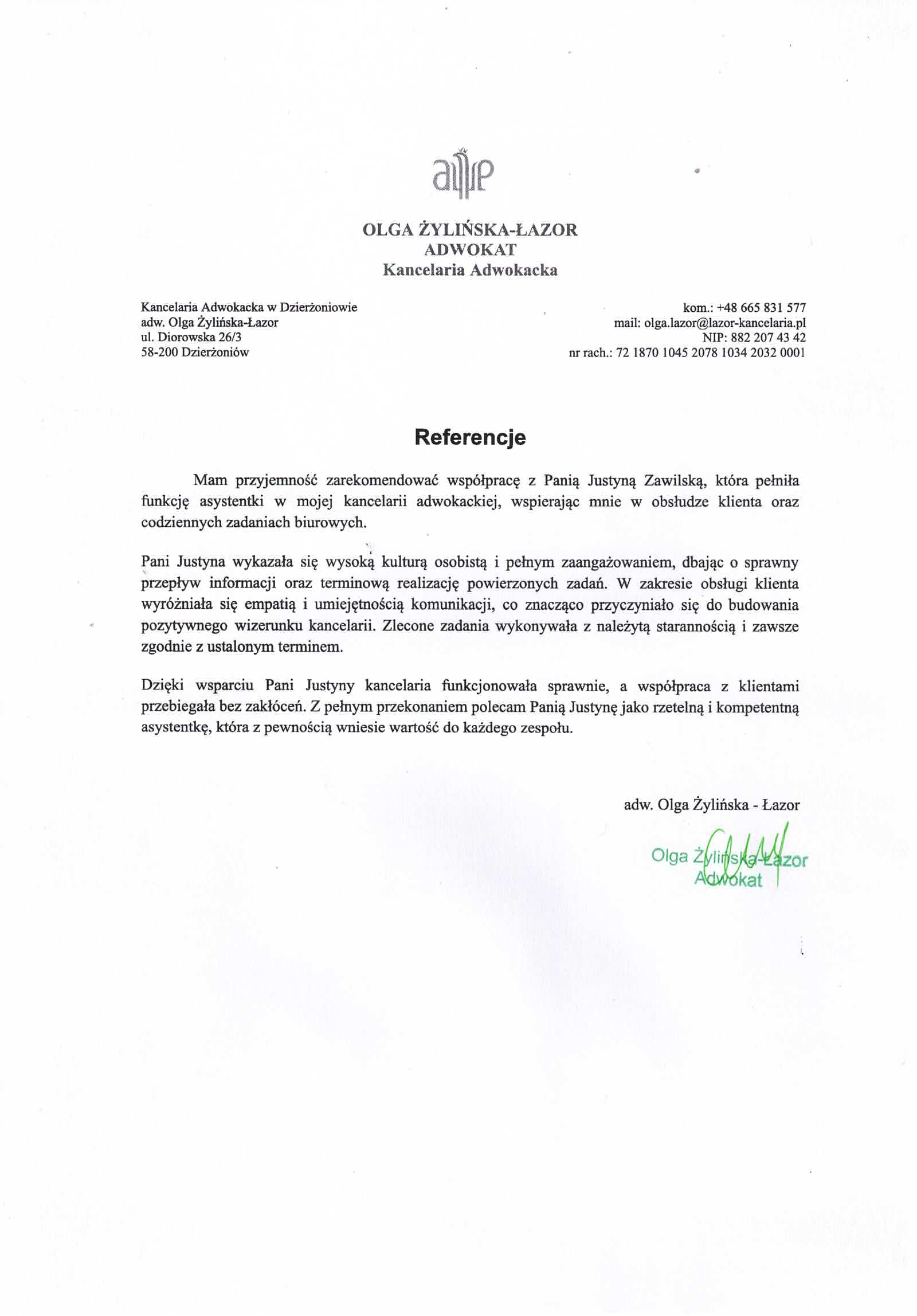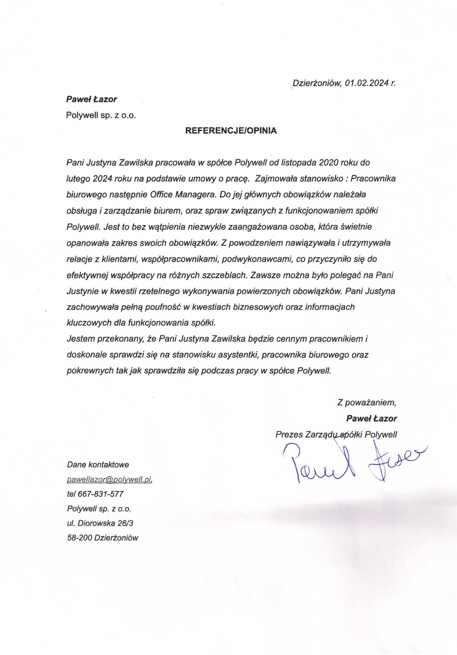 Z pełnym przekonaniem rekomendujemy Panią Justynę Zawilską jako rzetelnego i odpowiedzialnego partnera biznesowego.